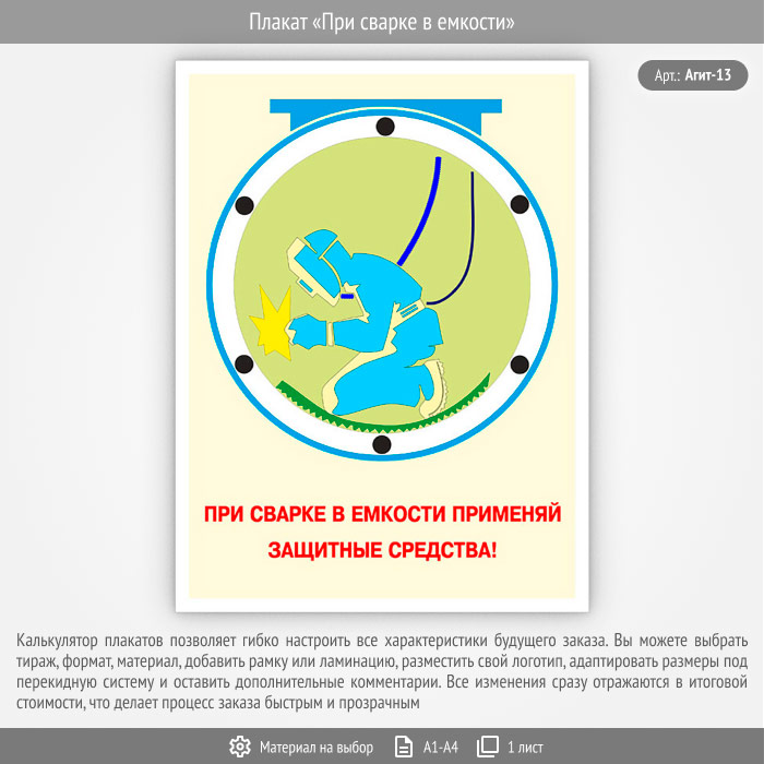 Плакат «При сварке в емкости» (Агит-13, 1 лист) в Видном купить
