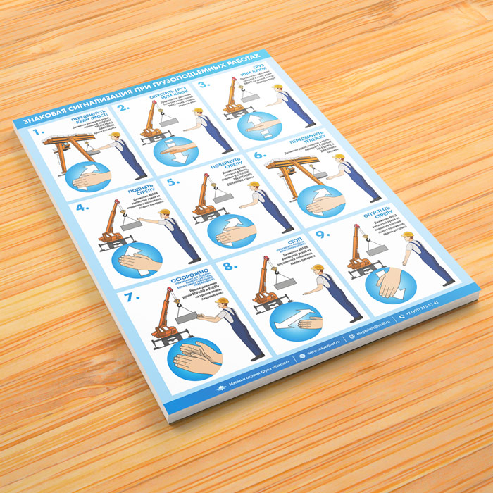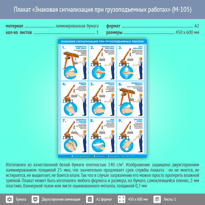 Плакат «Знаковая сигнализация при грузоподъемных работах» (М-105, ламинированная бумага, А2, 1 лист) в Видном купить