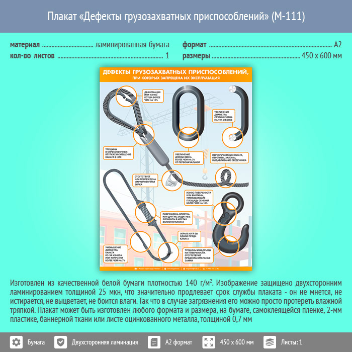 Плакат «Дефекты грузозахватных приспособлений» (М-111, ламинированная бумага, А2, 1 лист) в Видном купить