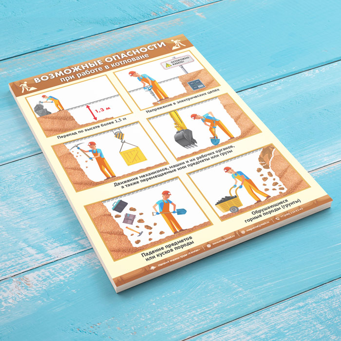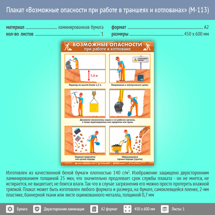 Плакат «Возможные опасности при работе в траншеях и котлованах» (М-113, ламинированная бумага, А2, 1 лист) в Видном купить