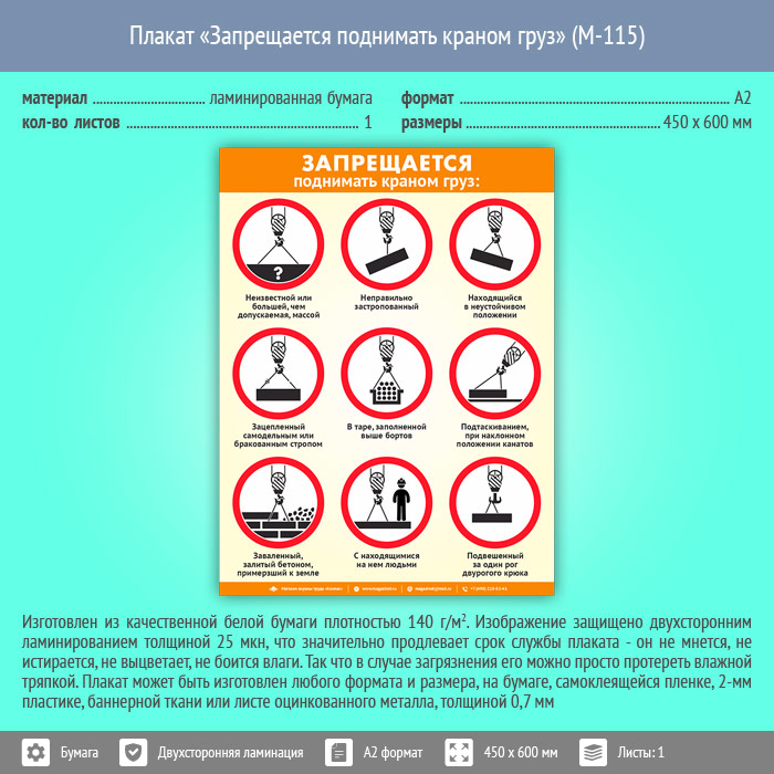 Плакат «Запрещается поднимать краном груз» (М-115, ламинированная бумага, А2, 1 лист) в Видном купить