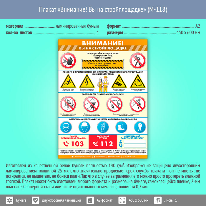 Плакат «Внимание! Вы на стройплощадке» (М-118, ламинированная бумага, А2, 1 лист) в Видном купить