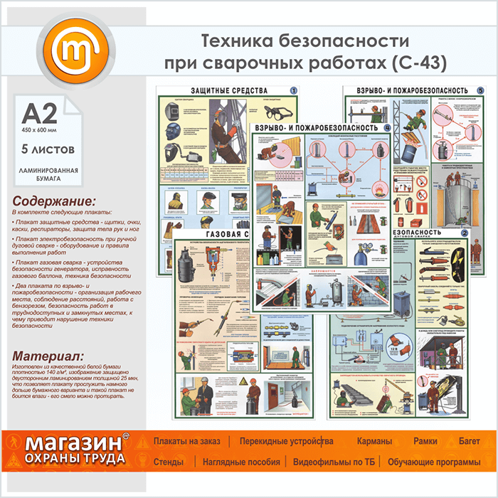 Плакаты «Техника безопасности при сварочных работах» (С-43, ламинированная бумага, А2, 5 листов) в Видном купить