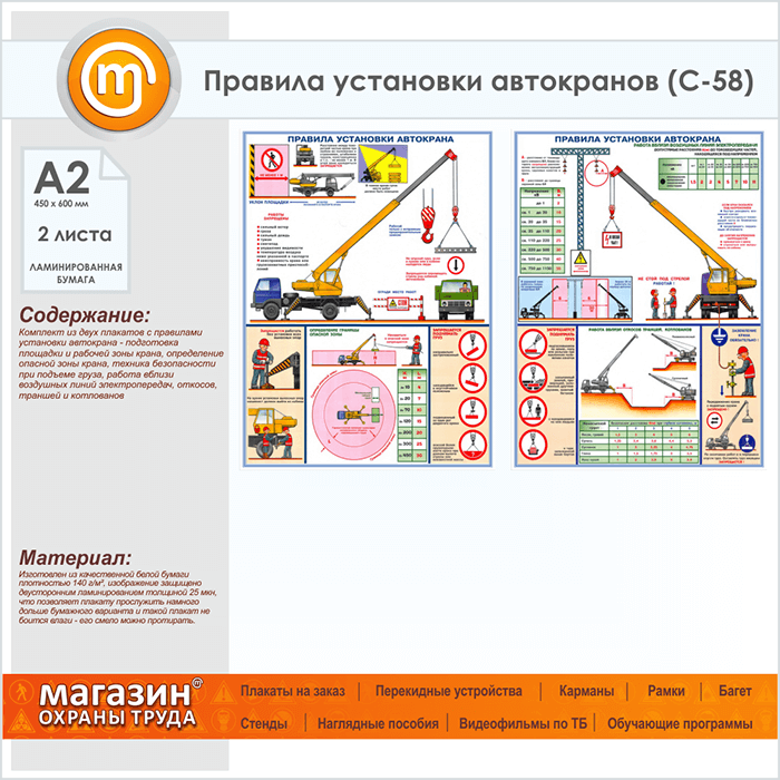 Плакаты «Правила установки автокранов» (С-58, ламинированная бумага, А2, 2 листа) в Видном купить