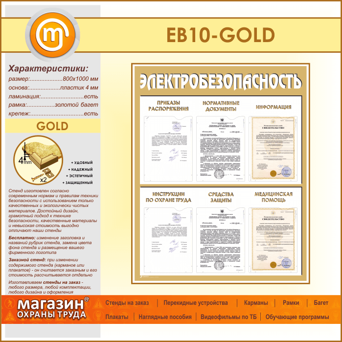 Стенд «Электробезопасность» с 6 карманами (EB-10-GOLD) в Видном купить