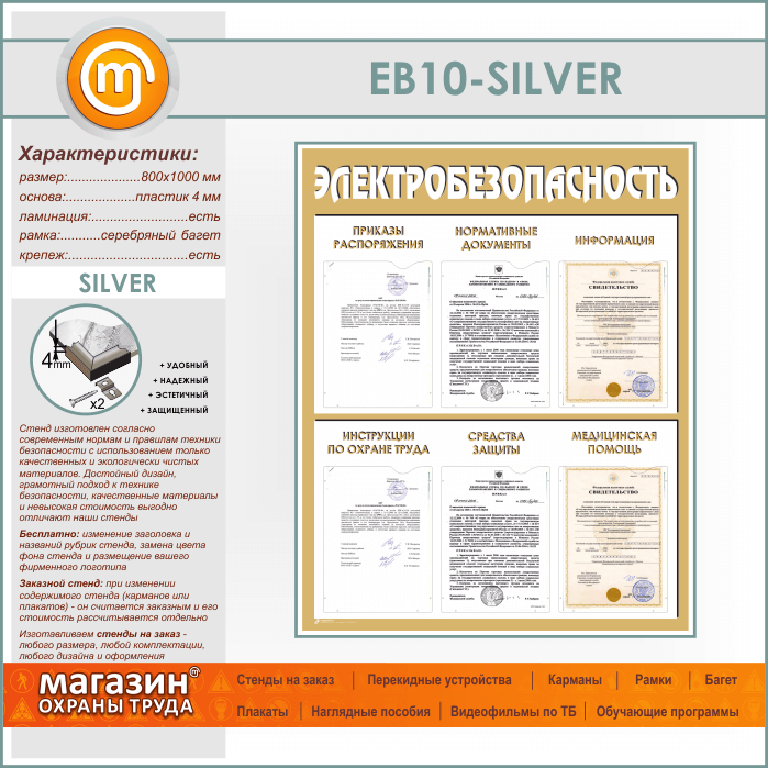 Стенд «Электробезопасность» с 6 карманами (EB-10-SILVER) в Видном купить