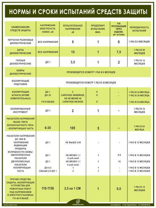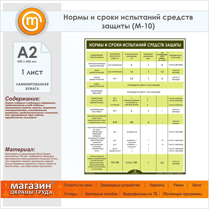 Плакат «Нормы и сроки испытаний средств защиты» (М-10, ламинированная бумага, А2, 1 лист) в Видном купить