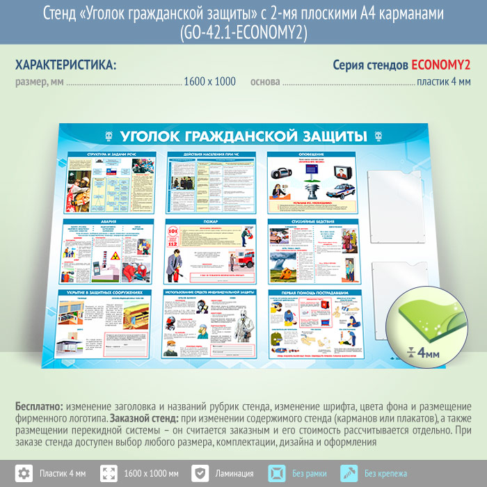 Стенд «Уголок гражданской защиты» с 2-мя плоскими А4 карманами (GO-42.1-ECONOMY2) в Видном купить