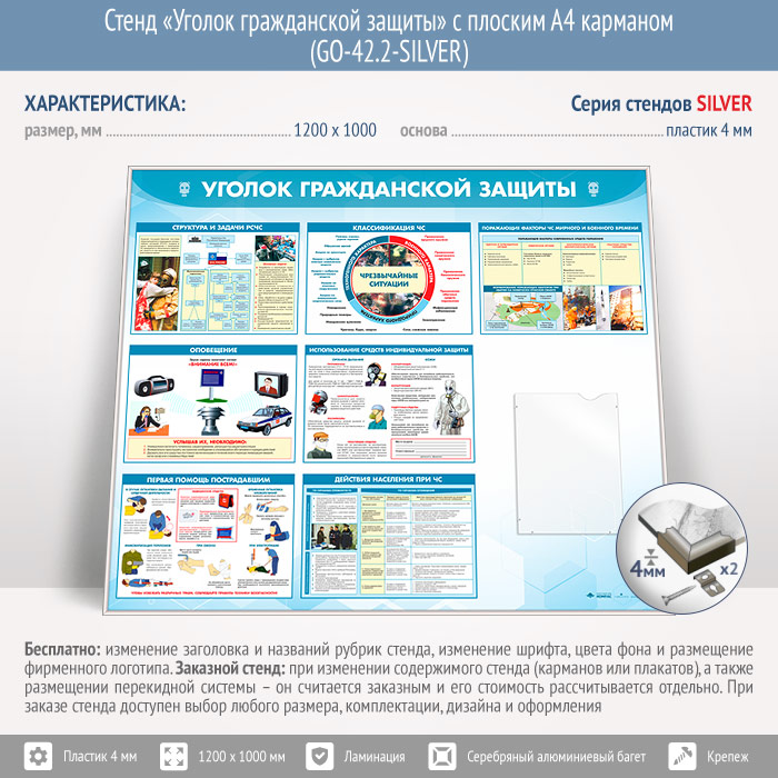 Стенд «Уголок гражданской защиты» с плоским А4 карманом (GO-42.2-SILVER) в Видном купить