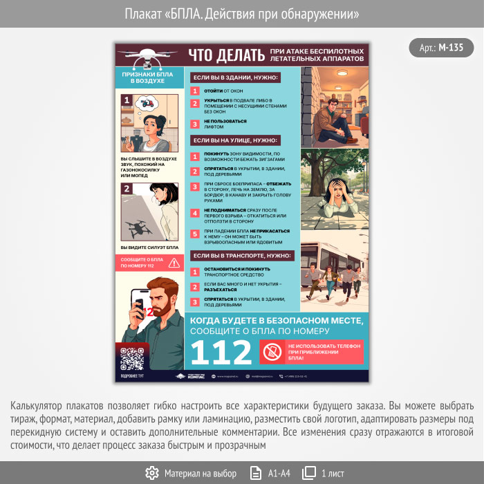 Плакат «БПЛА. Действия при обнаружении» с QR (М-135, 1 лист) в Видном купить