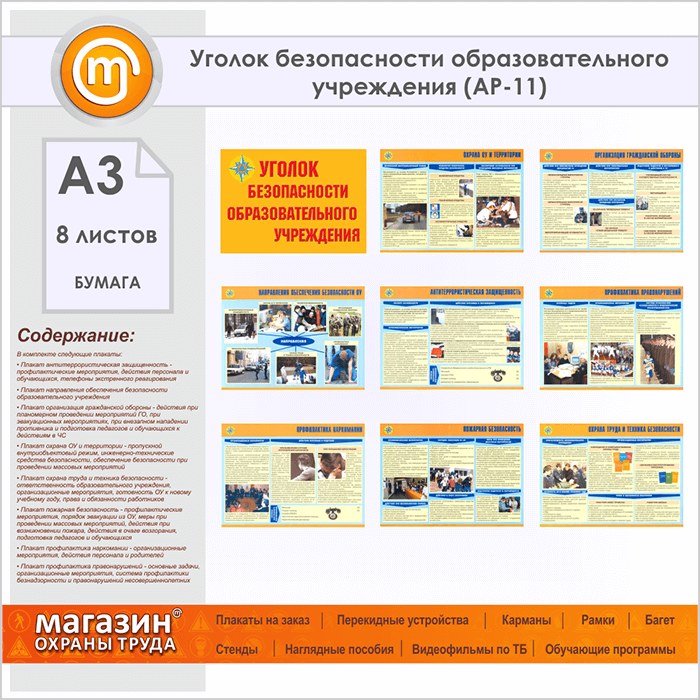Плакаты «Уголок безопасности образовательного учреждения» (АР-11, бумага, А3, 8 листов) в Видном купить