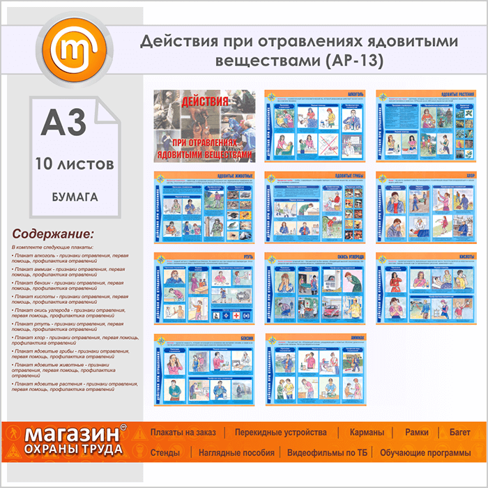 Плакаты «Действия при отравлениях ядовитыми веществами» (АР-13, бумага, А3, 10 листов) в Видном купить