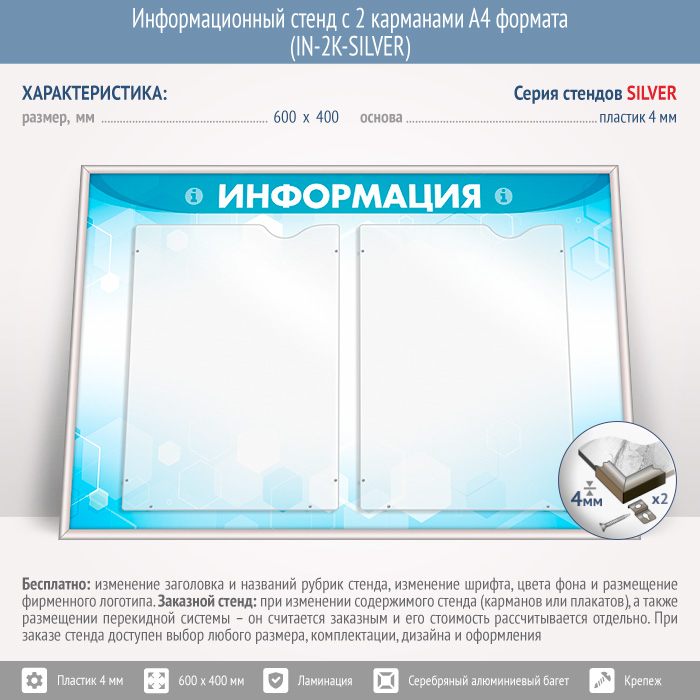 Информационный стенд с 2 карманами А4 формата (IN-2K-SILVER) в Видном купить