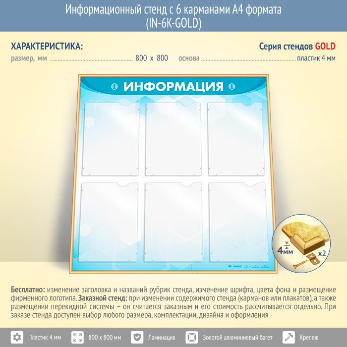 Информационный стенд с 6 карманами А4 формата (IN-6K-GOLD) в Видном купить