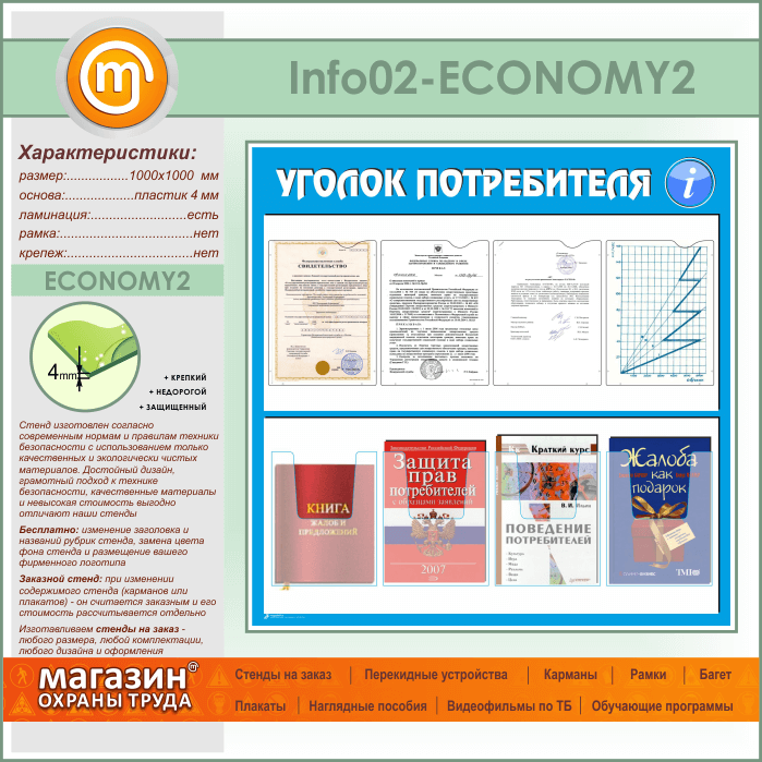 Стенд «Уголок потребителя» с 4 плоскими и 4 объемными карманами А4 формата (IN-02-ECONOMY2) в Видном купить