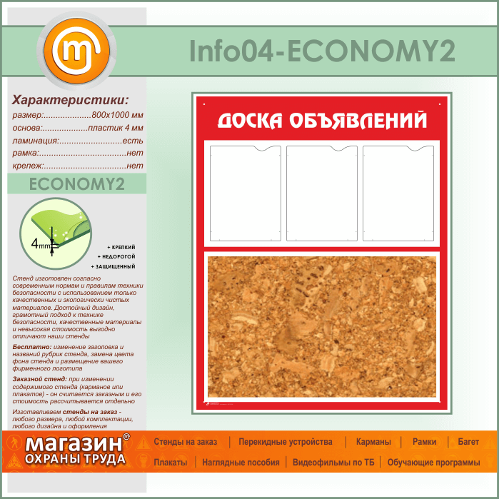 Стенд «Доска объявлений» с пробковым полотном и 3 карманами А4 формата (IN-04-ECONOMY2) в Видном купить