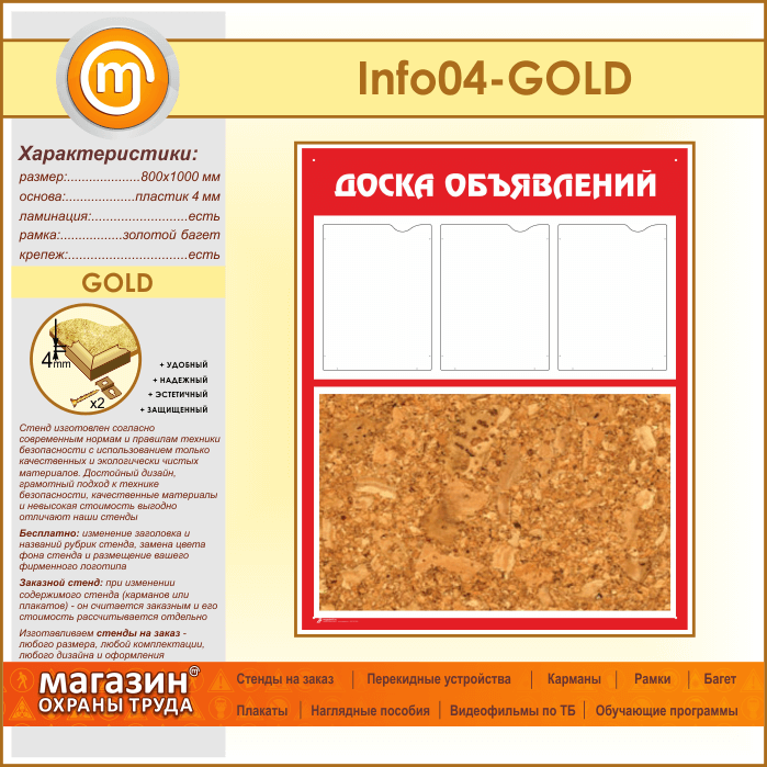 Стенд «Доска объявлений» с пробковым полотном и 3 карманами А4 формата (IN-04-GOLD) в Видном купить