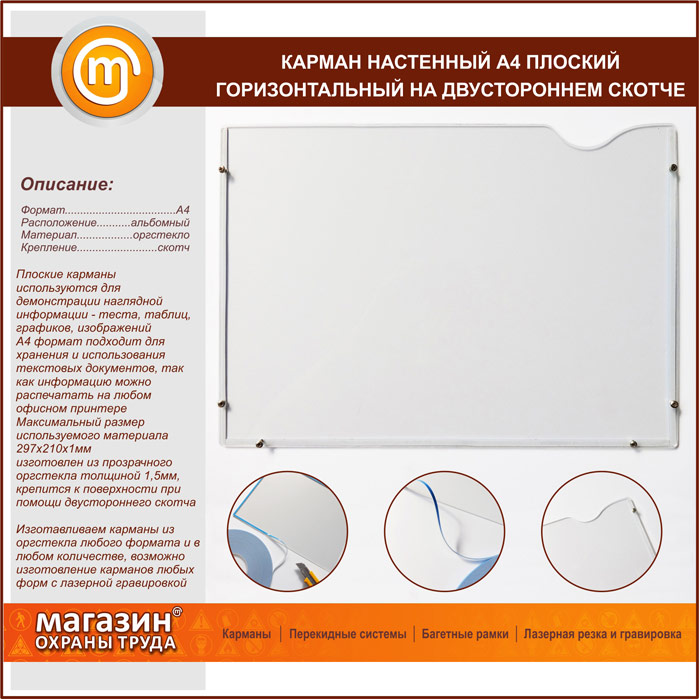 Карман настенный А4 плоский горизонтальный на двустороннем скотче в Видном купить