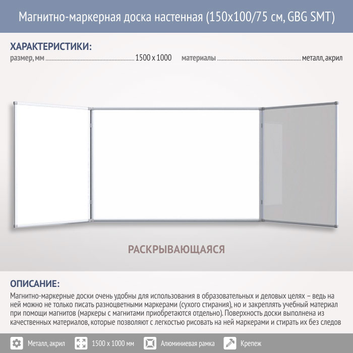 Магнитно-маркерная доска настенная (150x100/75 см, GBG SMT) в Видном купить