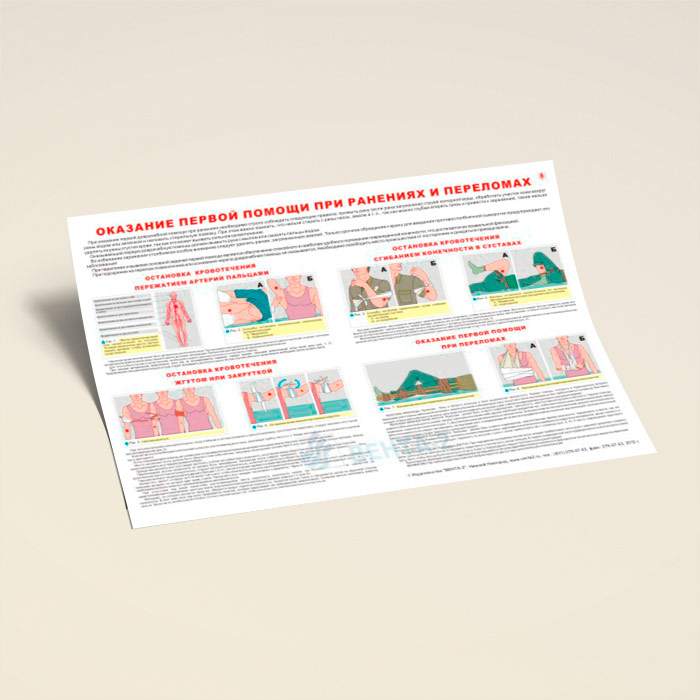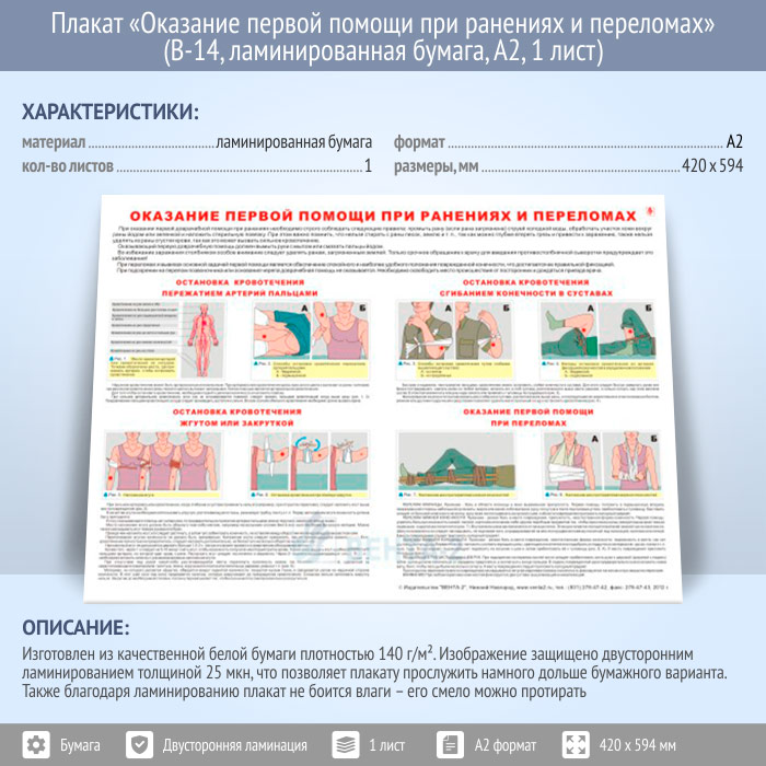 Плакат «Оказание первой помощи при ранениях и переломах» (В-14, ламинированная бумага, А2, 1 лист) в Видном купить
