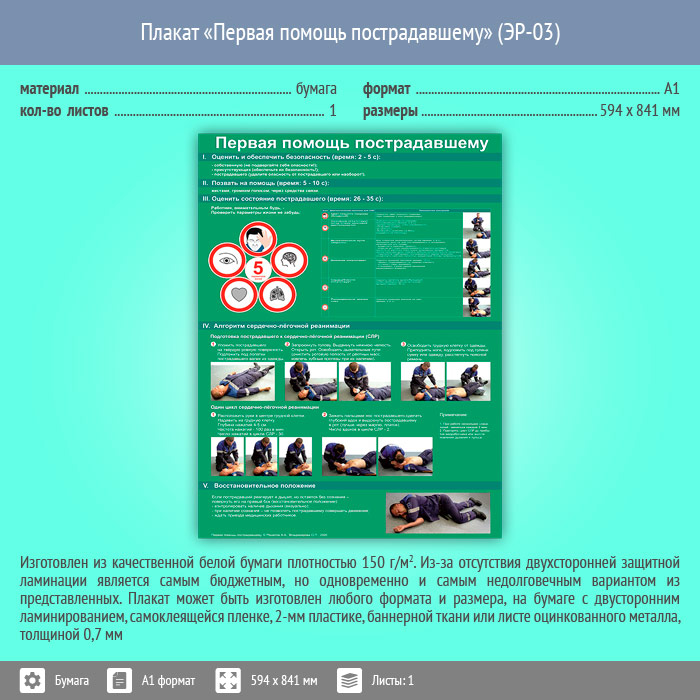 Плакат «Первая помощь пострадавшему» (ЭР-03, бумага, А1, 1 лист) в Видном купить