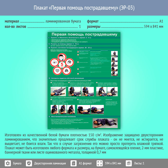 Плакат «Первая помощь пострадавшему» (ЭР-03, ламинированная бумага, А1, 1 лист) в Видном купить