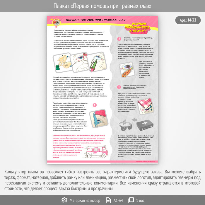 Плакат «Первая помощь при травмах глаз» (М-32, 1 лист) в Видном купить