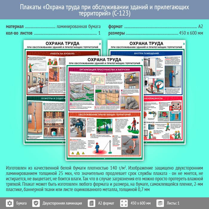 Плакаты «Охрана труда при обслуживании зданий и прилегающих территорий» (С-123, ламинированная бумага, А2, 3 листа) в Видном купить