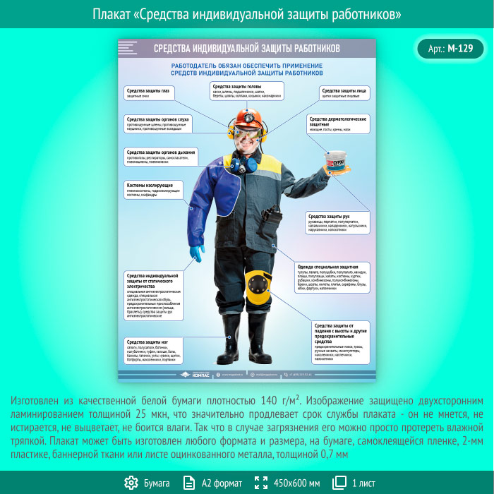 Плакат «Средства индивидуальной защиты работников» (М-129, ламинированная бумага, А2, 1 лист) в Видном купить