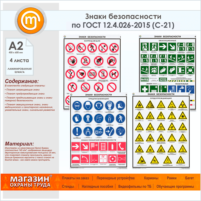 Плакаты «Знаки безопасности по ГОСТ 12.4.026-2015» (С-21, ламинированная бумага, А2, 4 листа) в Видном купить