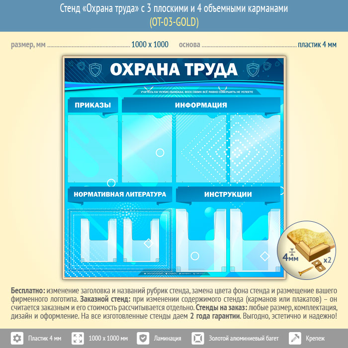 Стенд «Охрана труда» с 4 плоскими и 4 объемными карманами (OT-03-GOLD) в Видном купить