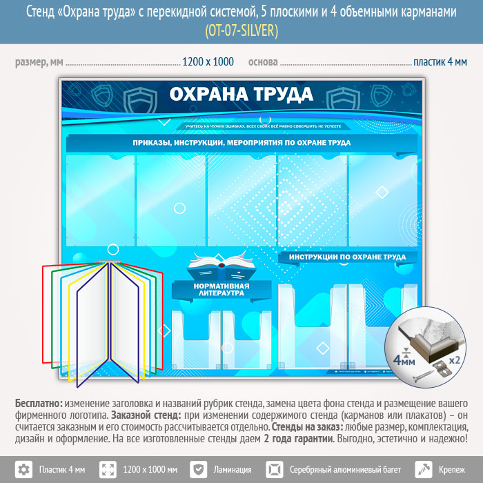 Стенд «Охрана труда» с перекидной системой, 5 плоскими и 4 объемными карманами (OT-07-SILVER) в Видном купить
