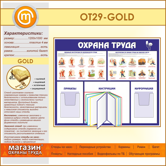 Стенд «Охрана труда» с перекидной системой и 2 объемными карманами (OT-29-GOLD) в Видном купить