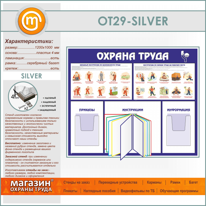 Стенд «Охрана труда» с перекидной системой и 2 объемными карманами (OT-29-SILVER) в Видном купить