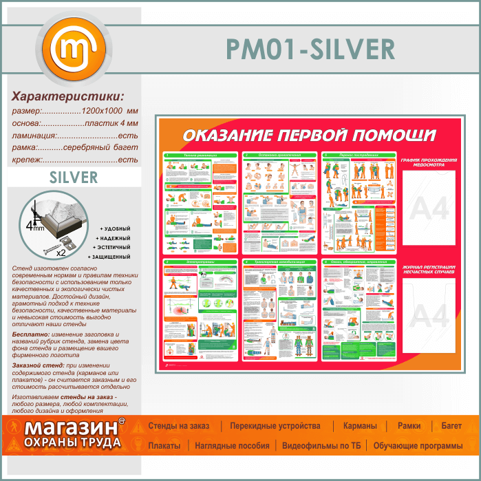 Стенд «Оказание первой помощи» с плоским и объемным карманами (PM-01-SILVER) в Видном купить