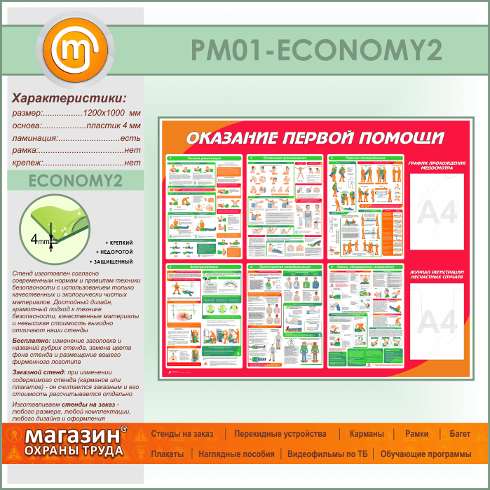 Стенд «Оказание первой помощи» с плоским и объемным карманами (PM-01-ECONOMY2) в Видном купить