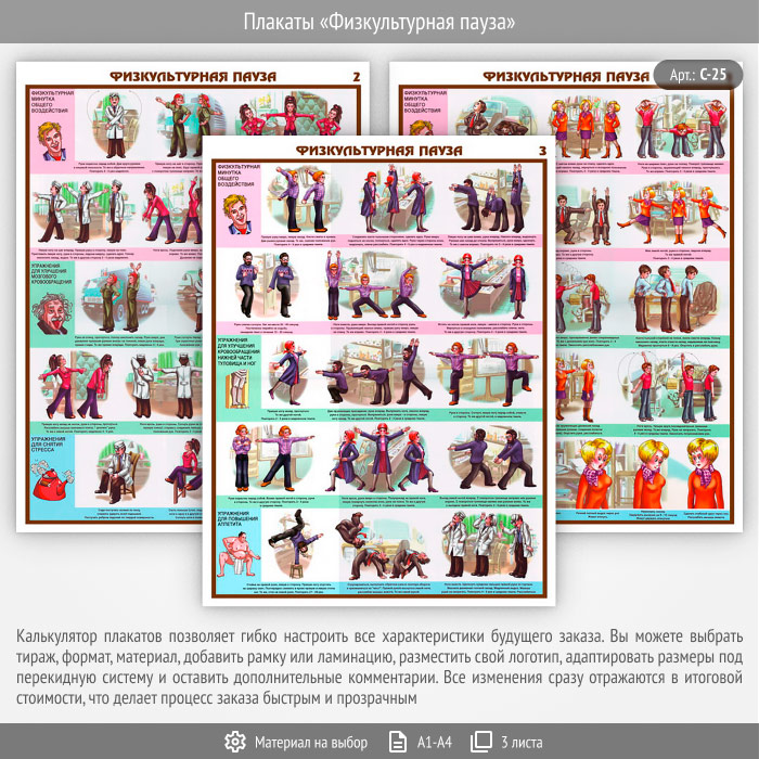 Комплект плакатов «Физкультурная пауза» из 3 листов, наглядно демонстрирующих упражнения для поддержания общей физической формы – физкультурная минутка общего воздействия, упражнения для снятия утомления с плеч, дыхательные упражнения, упражнения для улучшения мозгового кровообращения, упражнения для снятия стресса, упражнения для улучшения кровообращения нижней части туловища и ног, упражнения для повышения аппетита