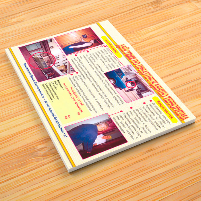 - Плакат «Действия при обнаружении взрывного устройства» – что необходимо и что запрещается делать, признаки взрывных устройств