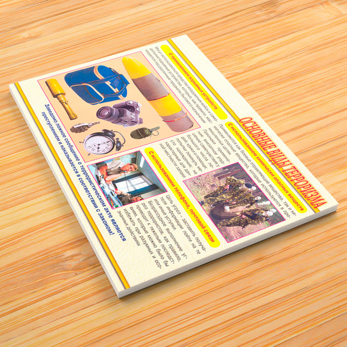 Комплект плакатов «Меры по противодействию терроризму» из 8 листов может быть изготовлен любого формата и размера, на бумаге, самоклеящейся пленке, пластике, баннерной ткани и металле. Разрабатываем, рисуем и изготавливаем плакаты на любую интересующую Вас тематику