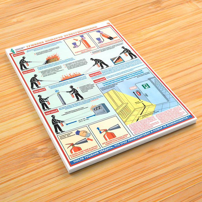 • Плакат «Тушение пожаров огнетушителями» – классы пожаров A, B, C, D, E, F, размещение огнетушителей в общественных зданиях и сооружениях