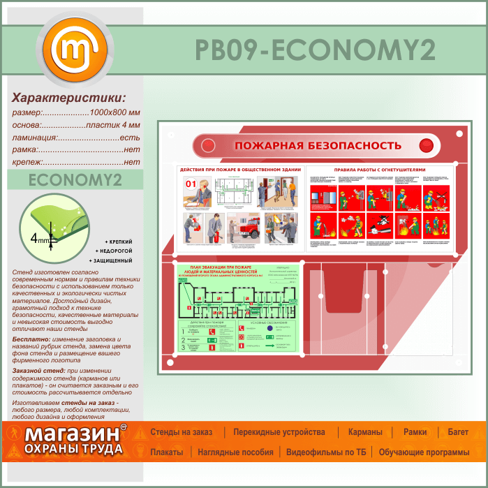 Стенд «Пожарная безопасность» с планом эвакуации, плоским и объемным карманами (PB-09-ECONOMY2) в Видном купить