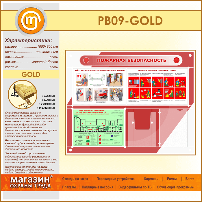 Стенд «Пожарная безопасность» с планом эвакуации, плоским и объемным карманами (PB-09-GOLD) в Видном купить