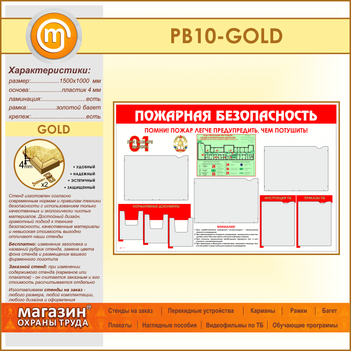 Стенд «Пожарная безопасность» с планом эвакуации, 5 плоскими и 3 объемными карманами (PB-10-GOLD) в Видном купить