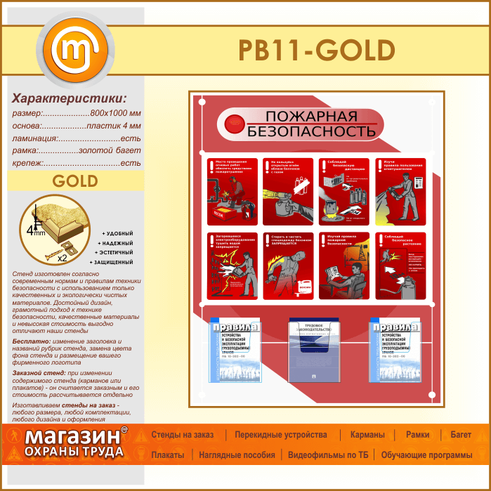 Стенд «Стенд пожарная безопасность в строительстве» с 3 объемными карманами (PB-11-GOLD) в Видном купить