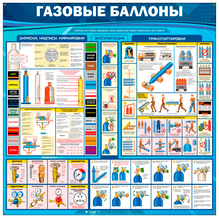 Стенд «Газовые баллоны» – это иллюстрированная информация об эксплуатации газовых баллонов, их окраска, надписи, маркировка, безопасность при транспортировке, погрузке и выгрузке, их хранении…