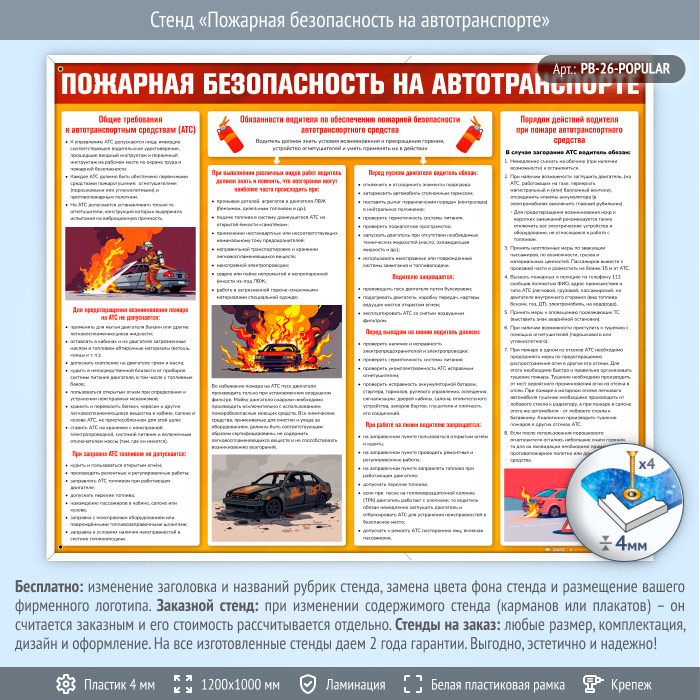 Стенд «Пожарная безопасность на автотранспорте» (PB-26) это важный инструмент для обеспечения безопасности на дороге. Он содержит ключевую информацию о требованиях к автотранспортным средствам, обязанностях водителей по поддержанию пожарной безопасности и порядке действий в случае возгорания. Стенд поможет подготовить водителей к чрезвычайным ситуациям и обеспечит безопасность как для них самих, так и для окружающих.