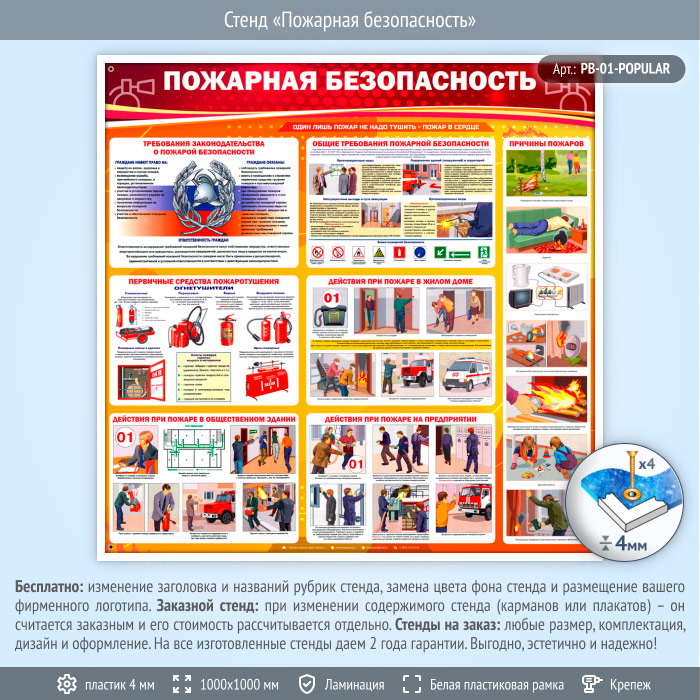 Стенд «Пожарная безопасность» – это наглядная информация о пожарной безопасности: требования законодательства о пожарной безопасности и общие требования, первичные средства пожаротушения, действия при пожаре в жилом доме, общественном здании, на предприятии…