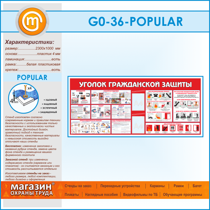 Стенд «Уголок гражданской защиты» – это важнейшая инструкция о действиях в чрезвычайных ситуациях: стихийные бедствия, аварии и пожары. Вся информация представлена наглядно и легко запоминается: оповещение населения и защита от ЧС, а также краткая информация об оказании первой помощи пострадавшим. Приведены примеры порядка выполнения действий в случае пожара, что можно, что нужно и чего не следует делать. На стенде также расположены 2 плоских кармана А4 формата
