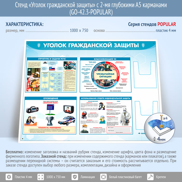 Стенд «Уголок гражданской защиты» с 2-мя глубокими А5 карманами - это важнейшая информация о необходимых действиях при возникновении чрезвычайных ситуаций