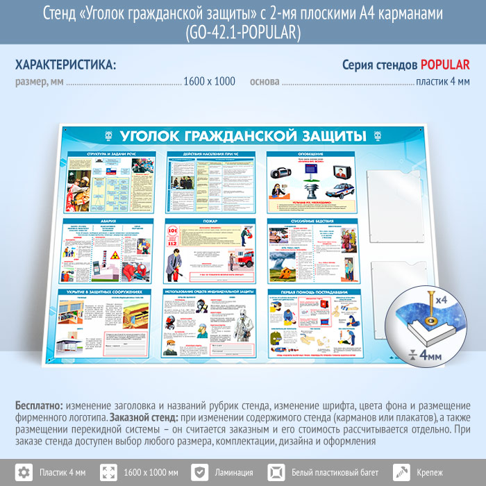 Стенд «Уголок гражданской защиты» с 2-мя плоскими А4 карманами - это важнейшая информация о необходимых действиях при возникновении чрезвычайных ситуаций